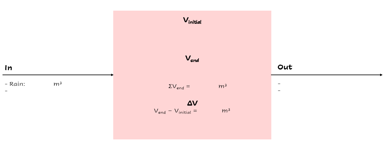 Draw your own water balance, indicating the inflow, volume change, and outflow. Alternatively, you can use the empty balance below: