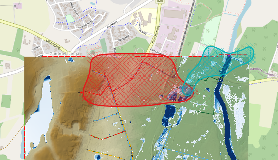 Langå is situated between raised agricultural lands to the west and the Gudena River to the east of the town. The urban area has a seperated sewer system. The sanitary sewer inclines towards a pumping station, and the stormwater sewer has two outlets close to the Gudena River.