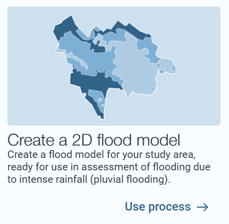 In Tutorial 1, you gathered various datasets and defined your study area. Now you will use these to create your own 2D flood model. Go to Processes and click on Create a 2D flood model, then read the information shown.