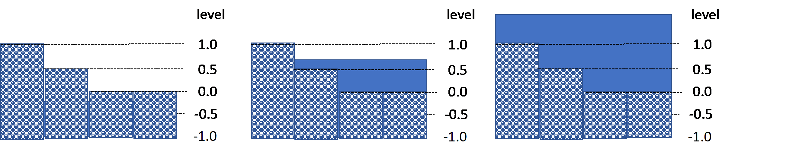 The figure and the table below show an example of de volumes in a calculation cell with interflow relative to the water level. In the last column the interflow settings are given. The rows in the table correspond to the situations displayed in the figure. The calculation cell’s area is one square meter and for simplicity the cells contains only 4 pixels