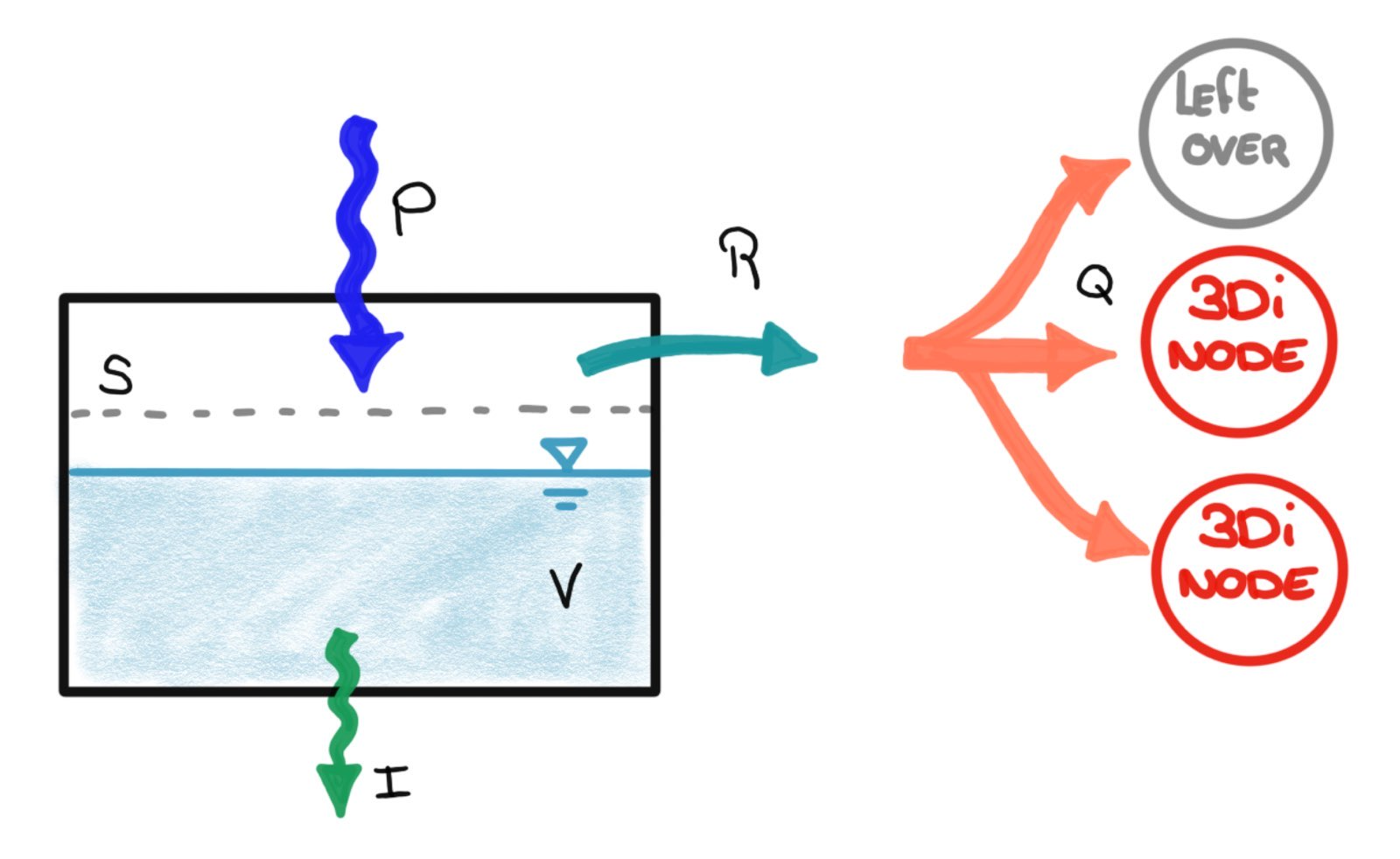 The surfaces define a box that is filled by precipitation. Once the box contains water, it can leave via infiltration. In case the precipitation rate is below the infiltration rate, the box is filling up. From the moment the volume exceeds the storage capacity, an outflow is initiated. That outflow is coupled to one or multiple calculation nodes; users can define how the outflow is distributed over the nodes. The runoff is computed based on the following parameters: | \(P\) is the precipitation [m3/s] | \(A\) is the surface area [m^2] | \(S\) is the storage capacity [m3], is based on the surface layer thickness [mm] | \(I\) is the infiltration [m3/s] | \(R\) is the runoff [m3/s] | \(k_Q\) is the outflow delay constant [/min] | \(Q\) is the inflow into the calculation node [m3/s] | \(\alpha\) is the inflow distribution factor [%]